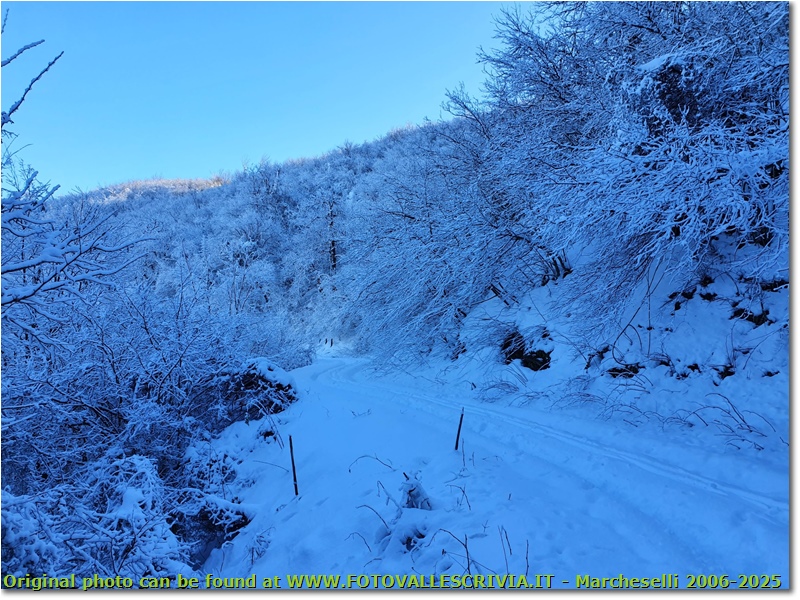 Strada ombrosa e innevata tra Crebaia e Alpe di Vobbia