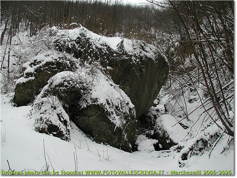 Fotografie: Masso di conglomerato spruzzato di neve - Savignone - 2004 - Boschi - Inverno - Olympus Camedia 3000