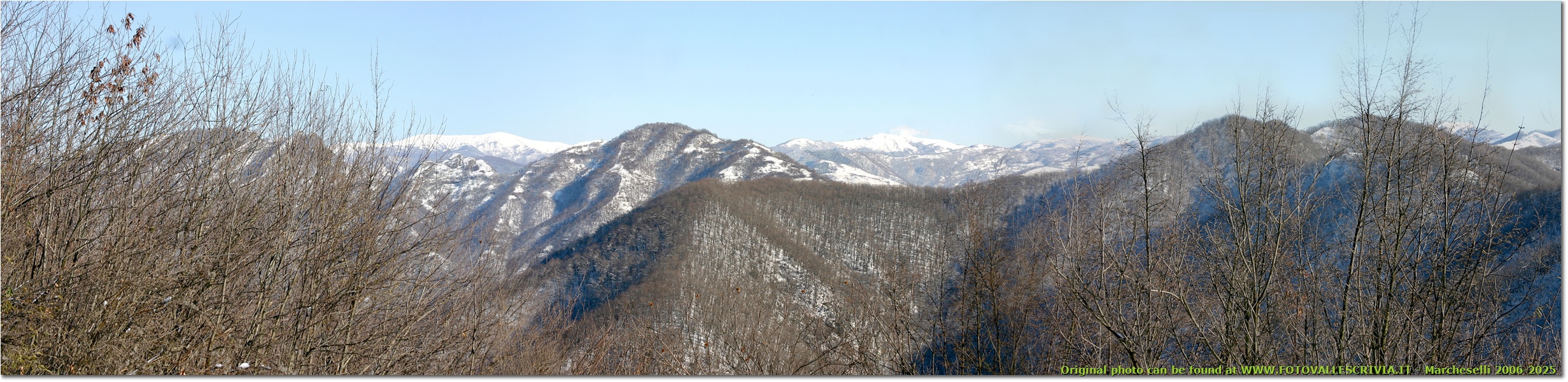 Al di là del Monte Pianetto di Savignone: boschi con neve nel Parco dell’Antola; sullo sfondo Catena dei Monti Liguri