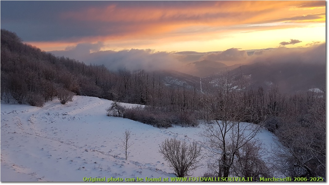 Tramonto sulla neve, da Montemaggio verso i forti di Genova